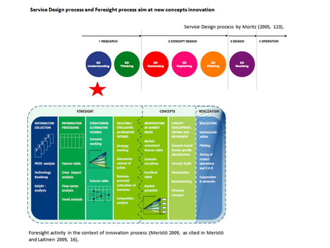 Another focus was to find out themes and topics where both Service Design activities and Futures Research activities were being discussed together. Based on this preliminary literature review we were able to summarize the findings describing the process, methods and synergy point-of-views on how Service Design meets Futures Thinking. Service Design process by Stefan Moritz (2005) served as a common platform for the purpose.
