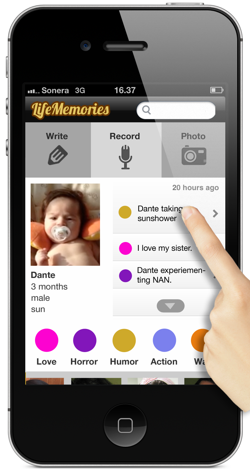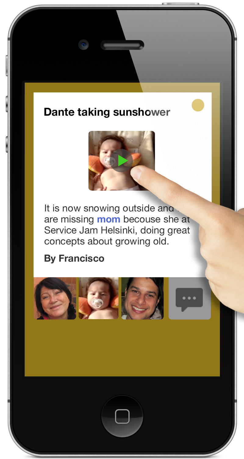 The audience of our application is members of a family. Basically you create family members´ profiles and fill them with stories; which you remember and other members can connect to those same stories, sharing their point of view. Current memories are also saved. You can create videos, sound memories, pictures and short stories. In the end you have all the stories categorized by genres, as in storybooks, a funny way to search for life moments and a family tree easy to check. Even people who are not here any more could have a profile and the stories safe for the ones who would like to share what they know about them. Memories like: Hi Mom! How did you access the Internet before computers existed? – Could be shared with your closest member family or the ones are living far from you.