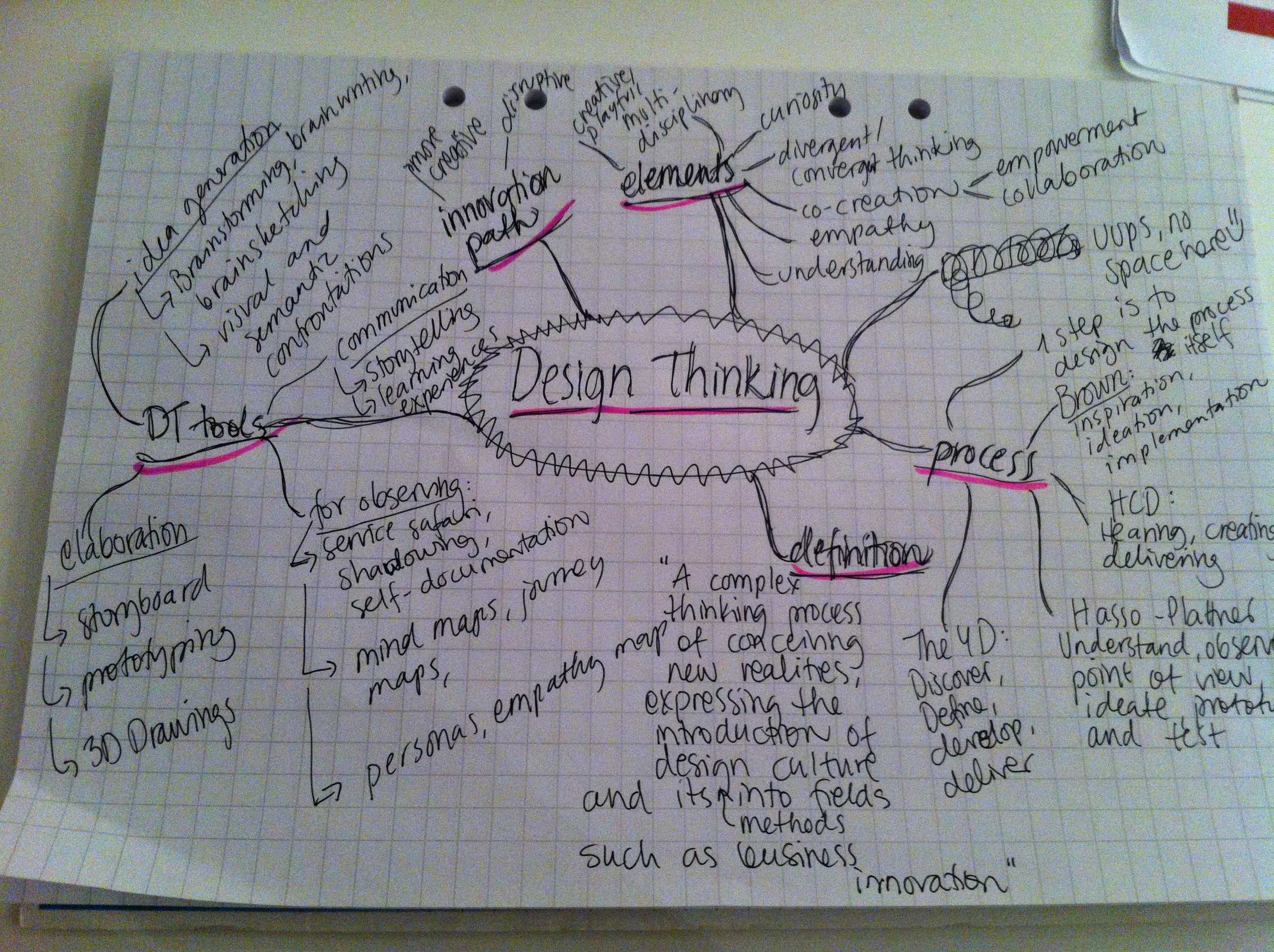 To give a brief summary of how I feel about Design Thinking is that it is a method that uses methods used in design to visualize a thought or a process. Design Thinking is not directed at the designers alone, the core of the method is in its way of uniting a multidisciplinary team around the same challenge. To be able to express your thoughts in a divergent, creative and visual way, regardless of whom you are sitting with, is the basis of the method.