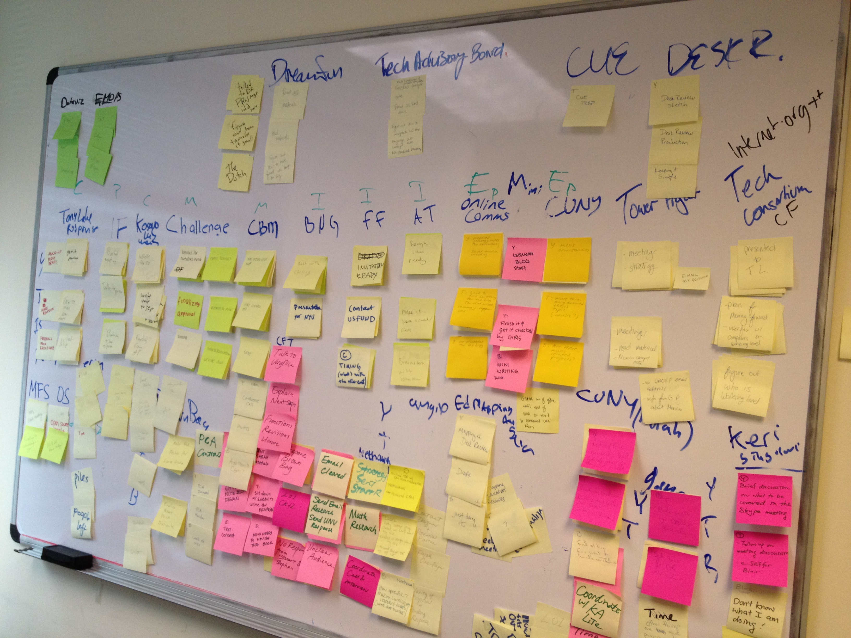In addition to two assigned rooms, we sit in an open space where we can choose our working spots daily. Everywhere you go there are sticky notes, sketches, white boards, plans, graphics, process charts, hand-drawn calendars, pictures, you name it.