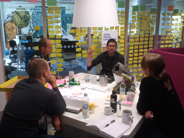 Finally our team, addition to Minna and me, included Antti Kytö and Jaakko Porokuokka, all SID13 Laurea students. I knew – despite none of us being a real hacker in code – this team could do anything related to creating awesome business concepts using our service design methods and toolkits. Luckily later the hacking part was completed when I persuaded my colleague and friend Lassi Jatkola to join our team. Before the event itself the team studied trends and innovations in the financial sector and shared views and ideas through chat.