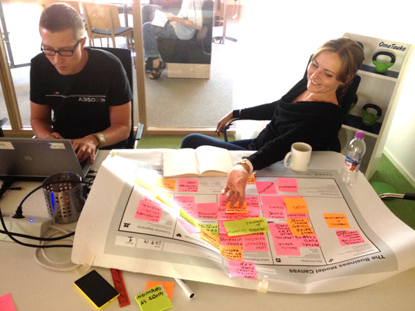 Mika and MInna drafting the strategic three staged Business Model Canvas