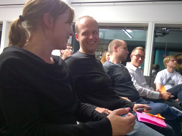 Happy team having some beers, ciders and feeling exited before giving the final pitch for the audience.