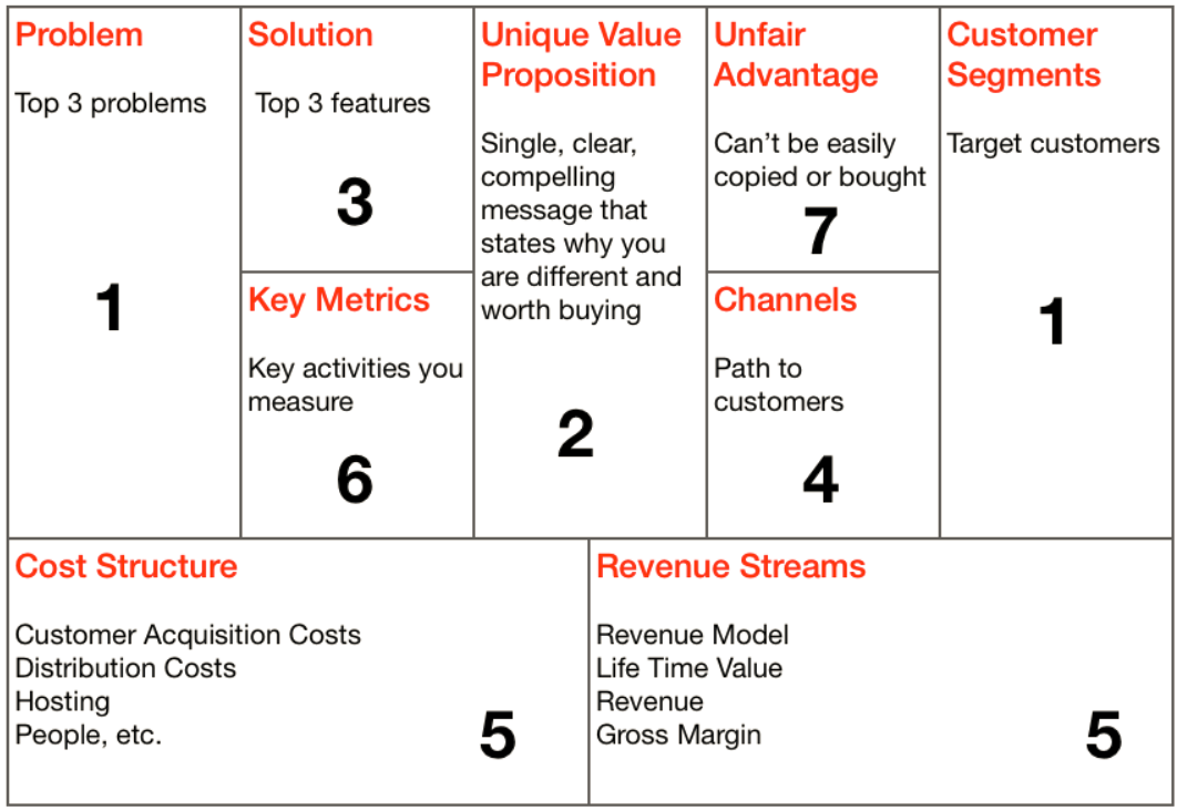 Instead of traditional business plans the Lean method highlights making hypothesis -> summarizing the hypothesis in a business model canvas -> creating a minimum viable product -> asking feedback from the customers -> failing fast -> starting the development cycle all over again. In addition to the business model canvas, a particular lean canvas was developed.
