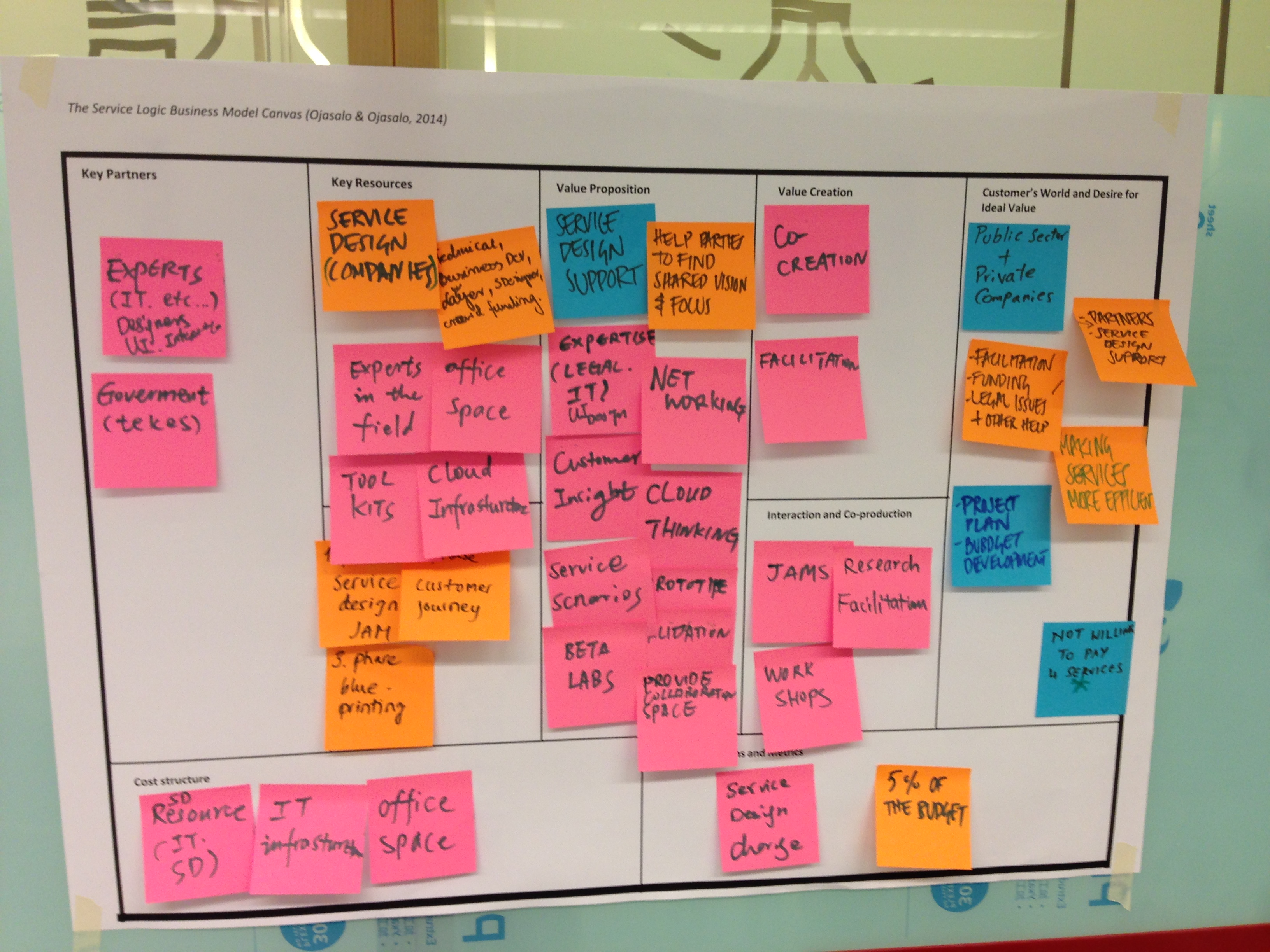 In November’s workshop we also worked on creating a Service-Logic Based Business Model Canvas for FORGE Service Lab. Service-Logic Business Model Canvas is a modification of the most popular business model framework and takes into account the service logic principles (Ojasalo & Ojasalo 2014). The purpose was to clarify the value proposition and redesign the service concept. We were to reflect on what could be the valuable service design support that FORGE offers to its customers. It was challenging I must say, as we also had to consider a systematic and efficient approach that enables creation of innovative, global services and raises the Finnish competence level towards leading position. Below is a picture of how our canvas looked after the workshop, so we still had a lot be accomplished and refined.