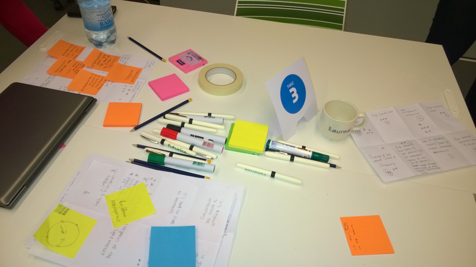 The secret theme was revealed globally on Friday Feb 27 at 6.30pm (local time)… The ideation began immediately and the theme was.. not known! See the starting video here. For me it took some time to realize that we don’t actually have a theme. We were divided in groups. Members of each group got empty A4 papers, one for each person. Then you were asked to fold up the paper to 8 segments and to write one challenge to every segment. When that was done, you handed over your ideas to a person next to you. Everyone shared three stars for the ideas on the paper and handed the paper over again to the next person.. That continued until you got your own paper back, and shared three stars to your own ideas. It was possible to give all the stars to one idea, or share the three stars between the eight ideas. Finally, we counted the stars given to each challenge and picked up the ideas with the most of stars. We grouped those ideas and decided what the challenge we want to get grips with is.