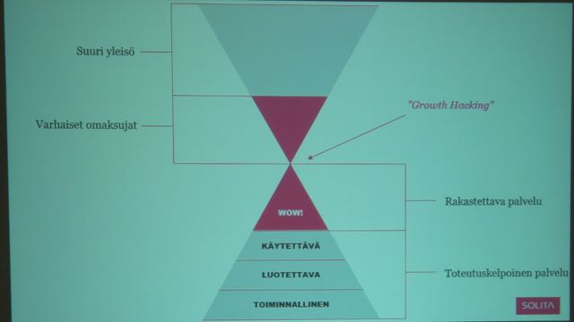 Lasse Tammilehto presented a model of this idea of a lovable service (picture 3). In order to win the early adopters and finally the big audience, the service must be usable, functional and reliable, which make the basis of a sufficient service. In the top is the WOW-effect which is needed for the service to be loved.