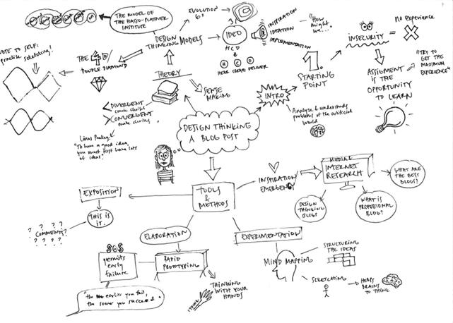 In the Experimentation phase (Evolution 6² model) I decided to make a Mind Map (Buzan & Buzan,1993) where I structured my ideas. The structured map creates the content of the blog post. In the Mind Map I also used sketching, which helps my brain to think and makes the outcome more legible.