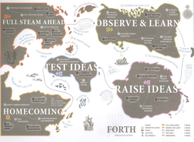 Gijs makes similarity between service designers and explorers like Columbus and Magellan to map innovation. The FORTH innovation method is a structured way to ideate new products services and business models presented in five steps: