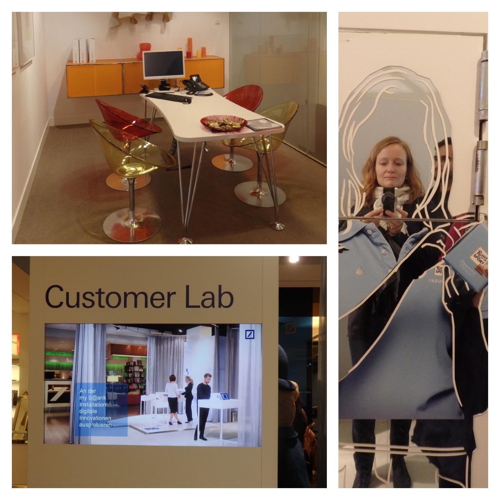 Last stop was to Deutsche Bank’s 101 concept store in the luxus brands’ street in Berlin’s Mitte – a mix of retail banking services, exposition space for partners, concierge service, a café and a customer lab. Deutche Bank has had this concept since the financial crisis of 2008. They wanted to rebuild trust with retail customers and bring something surprising adding more value to the customer visiting the branch. Currently the partner co-using the space is Harrod’s, selling christmas inspirated goodies and products. In the middle of the space there is a lounge area called customer lab, being used to introduce online services to customers and to workshop on service development with customers. On one side of the space the ATM’s are lined up and they use a specific identification method of veins’ recognition to those who have adopted this method of identification. On the same side with ATMs there are bank counters which are very minimalistic, all the banking affairs are done standing with the bank personnel. On the back of the space there is a cozy café with childrens’ play area and spaces for informal meetings with customers. There are also three differently decorated negociation rooms, targeted to young customers, families and young entrepreneurs. And finally a concierge service that can help out for example in customers’ travel or gift arrangements or even give advice to tourists! Quite a versatile concept and a very thorough tour that we received.