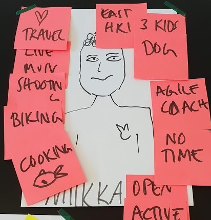 In the study unit one of our first assignments was to get to know each other and start building trust with the multidisciplinary team. In this exercise we introduced ourselves to the team, and we practiced sharing, active listening and visualizing the findings. This was really concrete way of understanding the 3 of the 5 underlying principles for Evolution 6^2 model: human centred approach, collaboration and visualization. We often forget the human aspect, and in with this exercise it was made concrete that every team member is an individual with specific skills and experiences. Collaboration was evident when team did the member cards by sharing the responsibilities: one is drawing, one is writing, one is sharing and others are listening. Example of my story visualized: