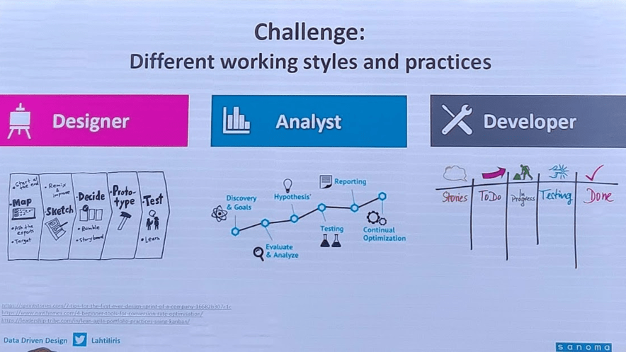 Both companies emphasized the important of collaboration. Sanoma Media Finland described well the challenge of a designer, an analyst and a developer working together (see picture below). All three have very different working styles and practices and yet all three are essential to develop the best service possible. To solve this issue, Sanoma Media Finland decided to change their way of working and started to follow Futurice’s Lean Service Creation process. It is not all smooth sailing yet, but they feel that they are on the right path.