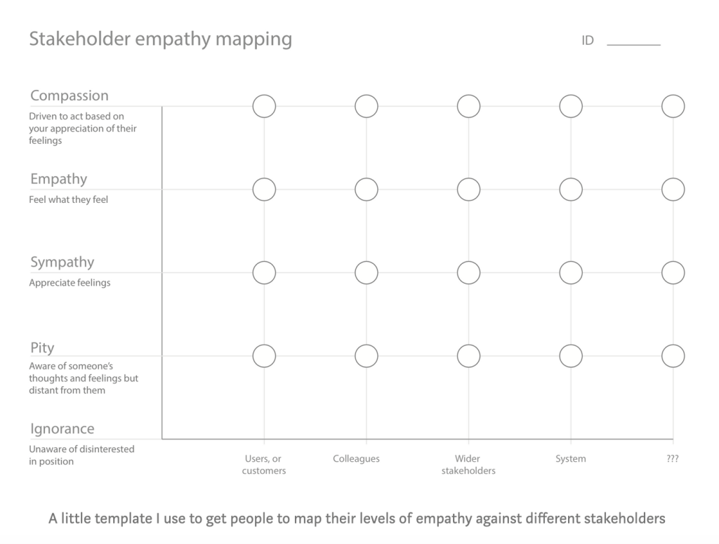 The author proposes a framework for an empathy map where you consciously adjust your feelings up or down as necessary while also keeping in mind other players besides the end user: