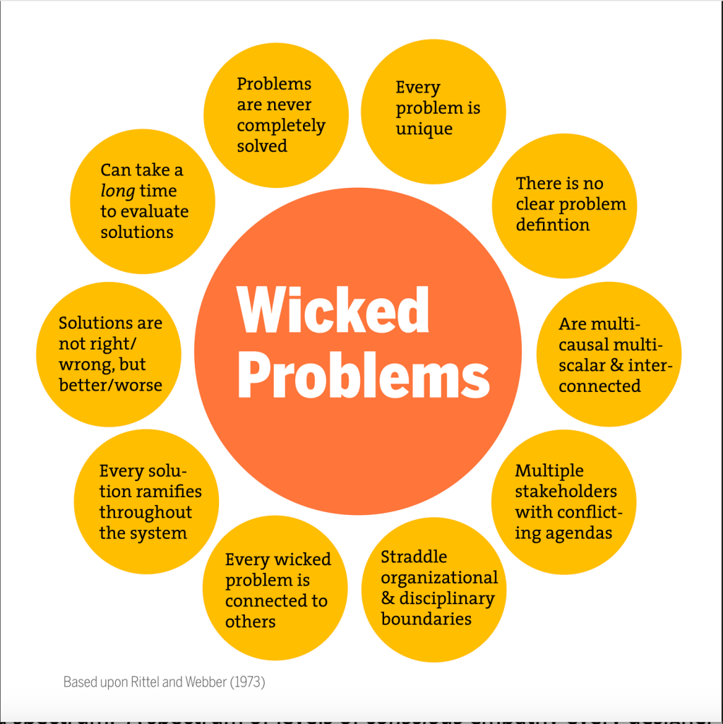 Wicked problems are manifested in the major issues and systemic failures of our society today. Issues such as climate change, poverty, multicultural integration, healthcare, and so forth are problems so prolific in nature that there are no single solutions or tangible ends to their plight.