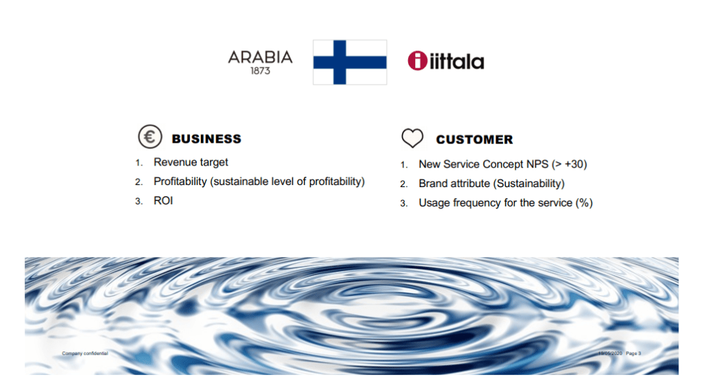 The project that Haatainen explained in her presentation was about one of Fiskars’ main category, tableware, and considered especially brands Iittala and Arabia. The purpose was to find out specifically what kind of aftermarket business opportunities there exists from circular economy point of view. Focusing on the smallest circular loop – reusing and reselling – is logical from the profitability perspective because it retains the value the best way as the products do not demand processing. As any business projects, also circular business projects must be profitable and valuable to the customer in order to be successful in the future. For this purpose, key performance indicators were specified right in the beginning of the project, defining aims for the business perspective as well as customer perspective (Picture 1).
