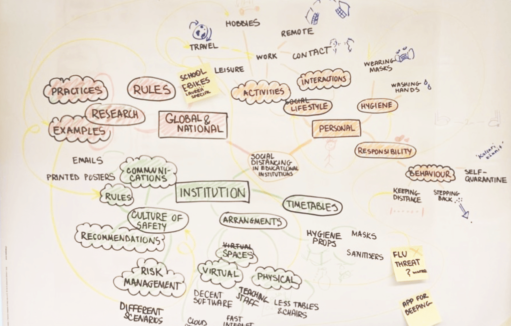 By throwing us in the deep end in the beginning we were forced to train what is the beginning of all thinking – ideas and creativity. We learned that creativity is not something a person has or not, but it is more like a muscle you can train. Many of us suffer from of our insecurities and prejudices such as “I’m not a creative person” and “I can’t come up with any ideas”. In the Social Distancing in Educational Institutions assignment we learned to create new ideas by making unlikely combinations of topics identified in mind maps.