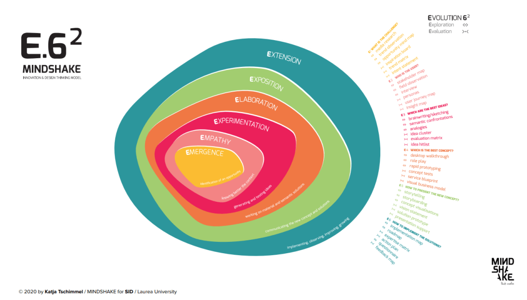 During a 2-days masterclass on Design Thinking at Laurea we were presented, and had a chance to use in practice, Katja Tschimmel’s Innovation & Design Thinking Mindshake model. The model includes a step-by-step process to design and create something new.