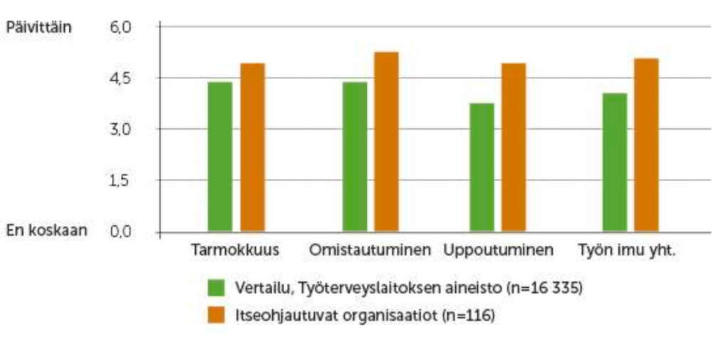 It seems that experienced well-being in self. Organizing companies is quite high. This is partly due the autonomy, freedom to choose and influence. When comparing traditional companies and self-organizing ones, it can be seen that work engagement is higher in self-organizing companies (Tampere University, 2021)