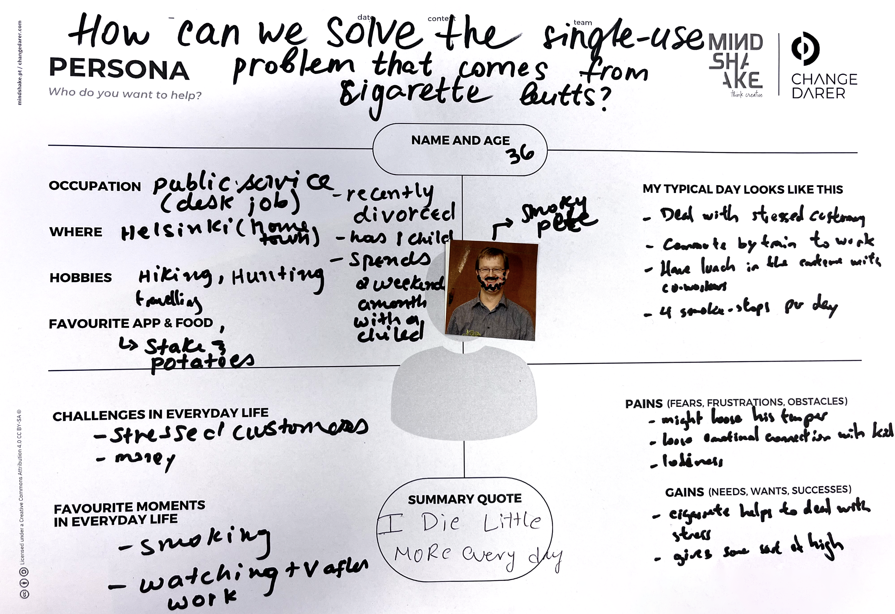 Leaving our comfort zone to interview people can take much work. For example, we realised that people felt judged when we started to talk about smoking with them. So, to be successful in this process, it’s important to create empathy when immersing in someone else’s world.