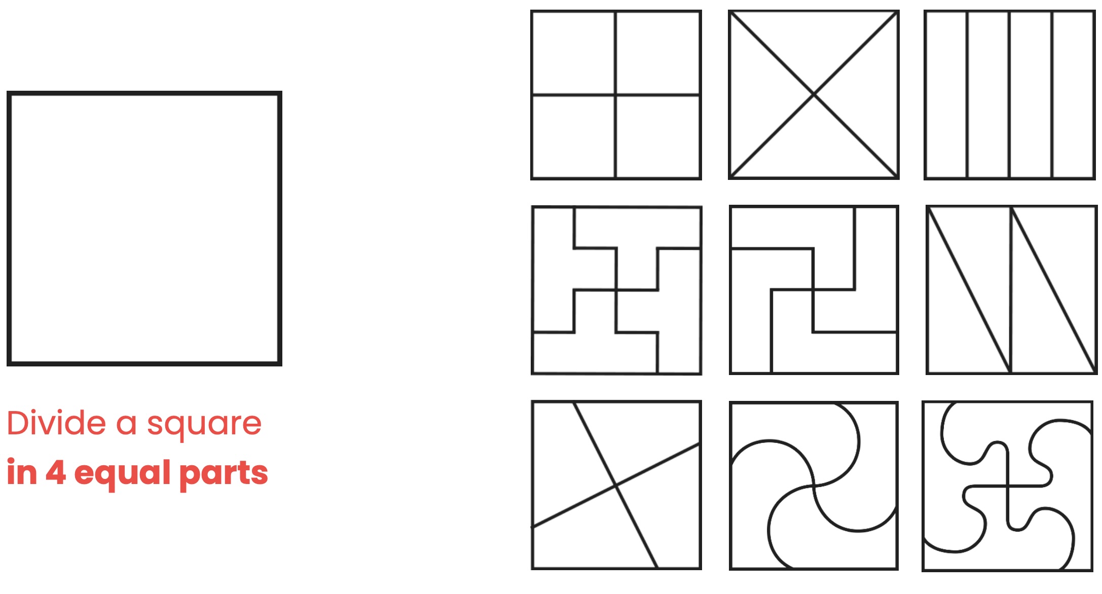 A creativity task required us to divide a rectangle into four parts in as many ways as possible. Initially, we struggled to move beyond obvious solutions, but gradually we realised that there are almost infinite possibilities when thinking creatively.