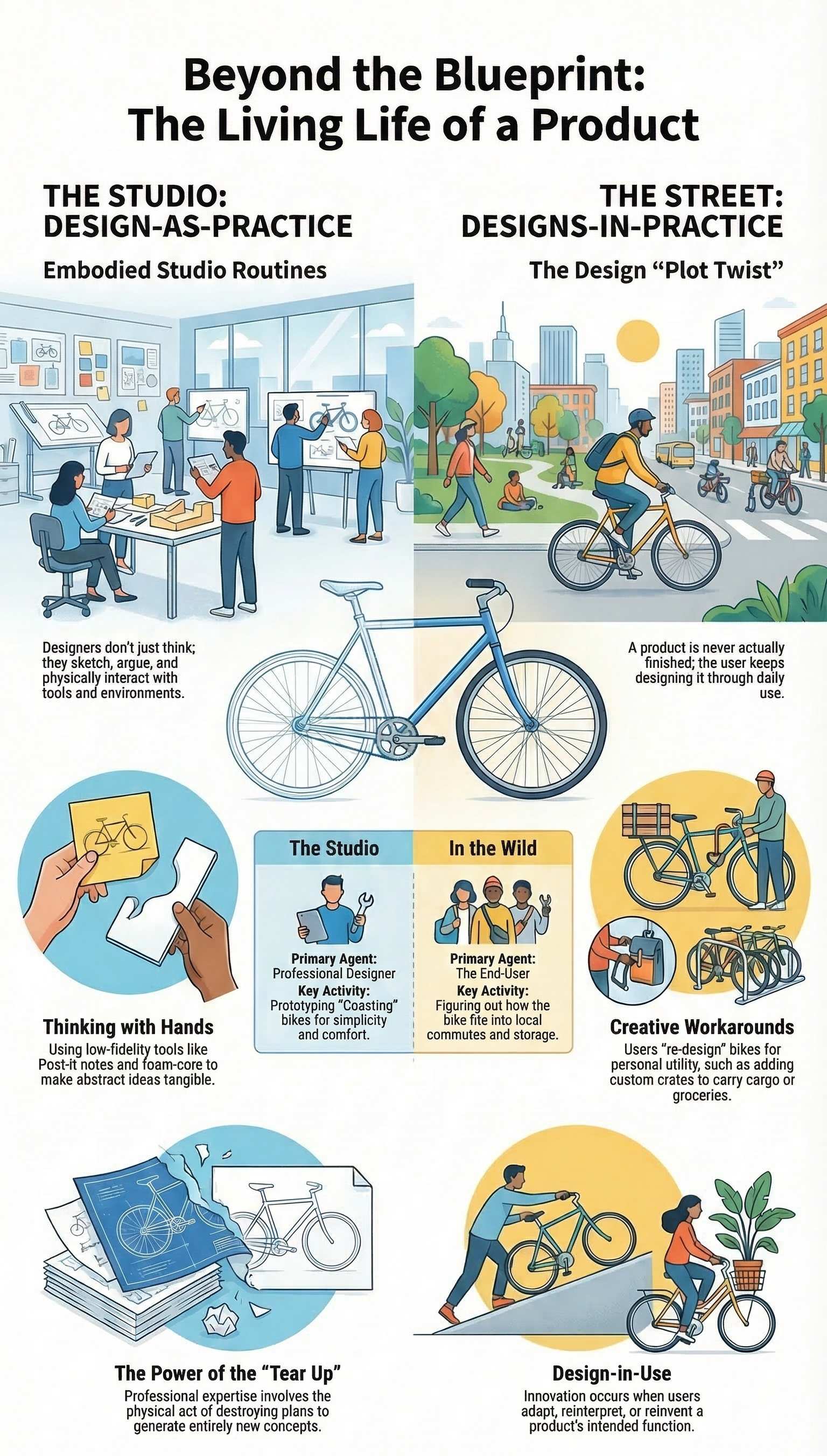 - Design-as-Practice: Instead of just thinking, designers draw, debate, re-organize, and work with actual tools and environments.
